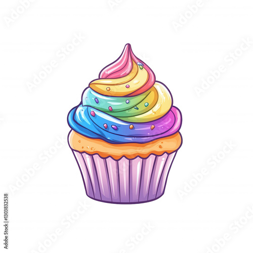 A colorful cupcake with swirled frosting and decorative sprinkles on top.