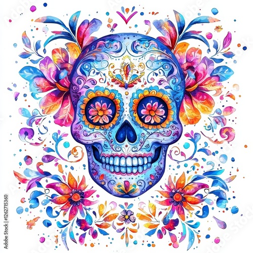 A colorful Day of the Dead skull with flowers, depicted in watercolor on a white background.