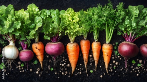 A colorful display of freshly harvested root vegetables and leafy greens.