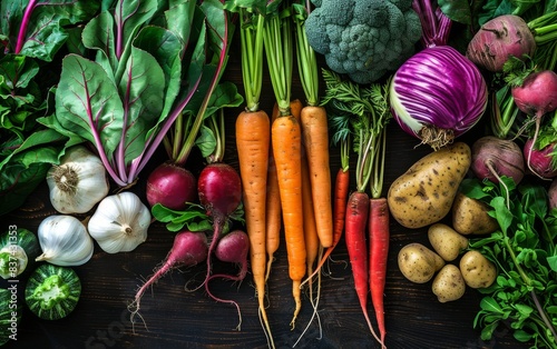 A colorful display of freshly picked vegetables, including carrots and beets with their leaves still attached, potatoes with green sprouts growing from them, garlic heads, artichokes