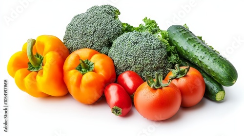 A colorful display of vegetables rich in vitamins and minerals, featuring broccoli, tomatoes, and bell peppers, isolated on a white background