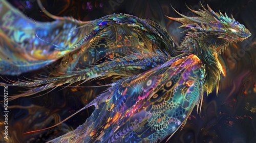 A colorful dragon with a blue eye and a long tail