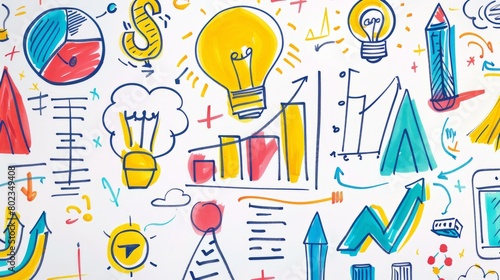 A colorful drawing of charts, graphs, and other symbols representing business and finance.