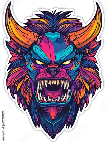 A colorful, fierce, and detailed illustration of a mythical beast with horns, fangs, and a vibrant, angular face.