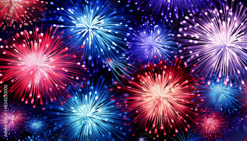 A colorful fireworks display with red, blue, and white fireworks