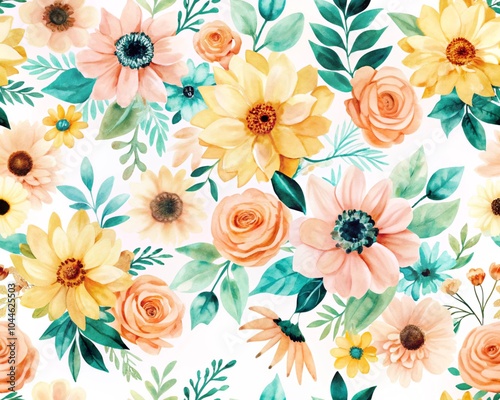 A colorful floral pattern featuring various flowers on a white background. Rose seamless pattern with watercolor isolated on white background. watercolor floral seamless pattern