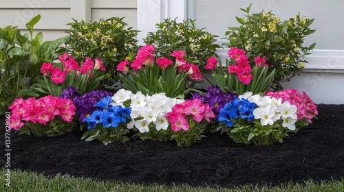 A colorful flower bed with neatly arranged tulips, daffodils, and petunias.