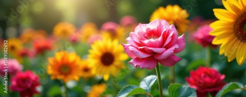 A colorful garden rotates on a mobile device, showcasing blooming roses and sunflowers with delicate petals , rotating blooms, blooming blossoms, colorful gardens