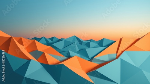 A colorful geometric landscape featuring orange and blue triangular shapes under a gradient sky.
