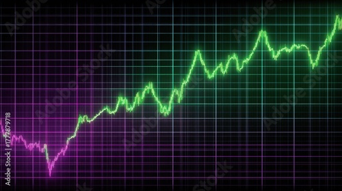 A colorful graph shows rising economic trends with green and purple lines against a grid background.