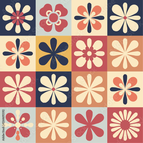 A colorful grid of flower patterns in soft pastels and dark colors, featuring various floral designs in a retro style