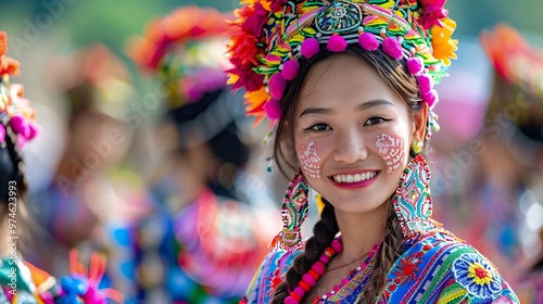 A colorful Hmong New Year celebration, with participants dressed in traditional costumes, engaging in cultural dances and rituals. The vibrant colors and joyful atmosphere highlight the cultural