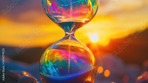 A colorful hourglass against a sunset backdrop, symbolizing the passage of time.