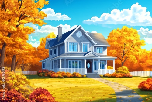 'A colorful house with a peak roof and large windows is set against a sunny blue sky and surrounded by vivid autumn landscaping.'