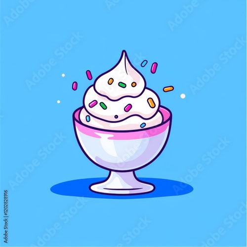 A colorful ice cream sundae topped with sprinkles in a clear bowl against a bright blue background.