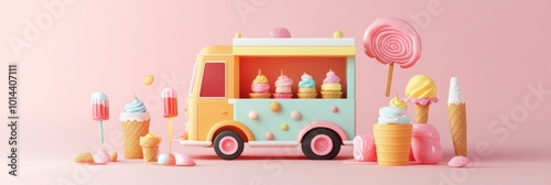 A colorful ice cream truck surrounded by various ice cream treats and sweets.