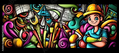 A colorful illustration featuring a smiling worker amidst various tools and vibrant designs.