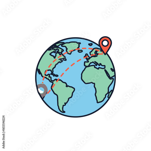 A colorful illustration of a globe with a location marker and dotted travel routes.