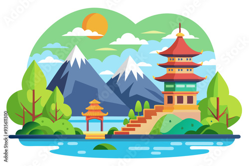 A Colorful Illustration of a Pagoda and Mountain Range with a Lake in the Foreground