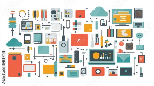 A colorful illustration of various digital devices and icons representing technology and digital lifestyle.