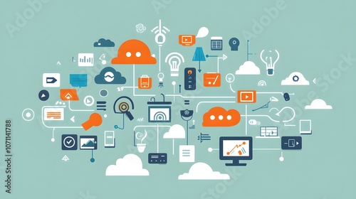 A colorful image of a cloud with many different icons and symbols. Concept of a complex network of technology and communication