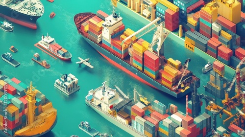 A colorful infographic-style depiction of global trade with ships, planes, and trucks, freight ecosystem concept .