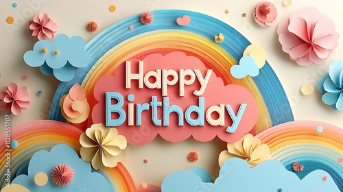 A colorful kirigami design of "Happy Birthday" embedded within a flowing composition of rainbow arches, each layer adorned with detailed paper patterns and glowing edges,