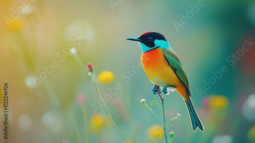 A colorful little bird perched on a flower stem in a garden, with blurred blossoms in the background.