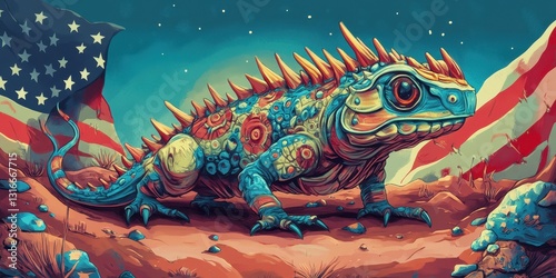 A colorful lizard stands proudly before flags of many colors