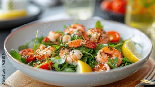 A colorful lobster salad with fresh greens, tomatoes, and lemon vinaigrette.