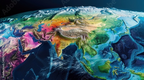 A colorful map of the world with the continents of Asia and Africa. The map is very detailed and shows the different countries and their borders