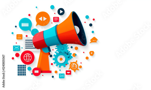 A colorful megaphone surrounded by various communication and media icons, symbolizing marketing and digital outreach.