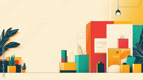 A colorful, minimalist interior scene featuring geometric shapes, vibrant plants, and decorative boxes in a warm, inviting setting.