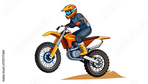 A colorful motocross rider soars through the air on a vibrant orange and white motorcycle, set against a plain white backdrop.