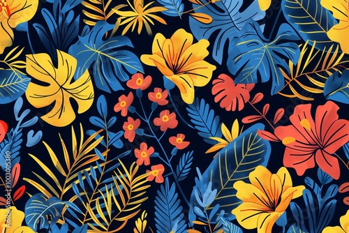 A colorful painting of a tropical forest with flowers and leaves