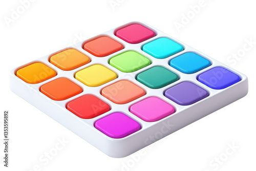 A colorful palette of square shaped buttons in a white tray on a black background studio shot