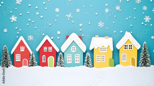 A colorful paper cutout of houses in the snow, with trees and a blue sky above, creating an adorable winter scene