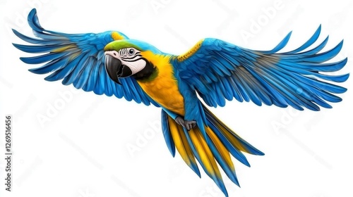 A colorful parrot takes flight against a plain white background. Its wings are spread wide, displaying vibrant plumage. The image is sharp and clear