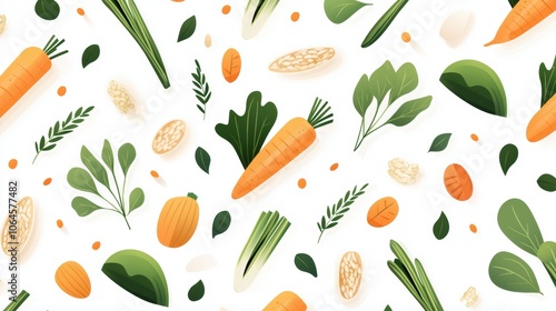 A colorful pattern featuring various vegetables, including carrots, greens, and nuts, set against a light background for a vibrant, fresh look.