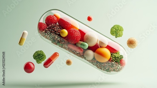 A colorful pill capsule filled with various fruits and vegetables, symbolizing nutrition and health benefits.