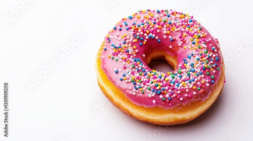 A colorful pink-frosted donut topped with sprinkles, set against a clean white background.
