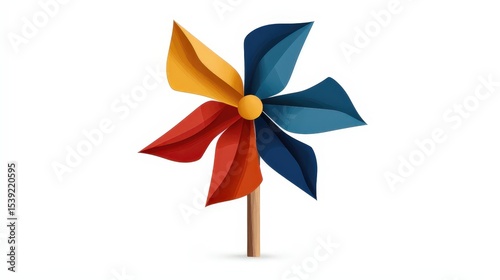 A colorful pinwheel with six blades in red, orange, and blue, mounted on a wooden stick against a white background.