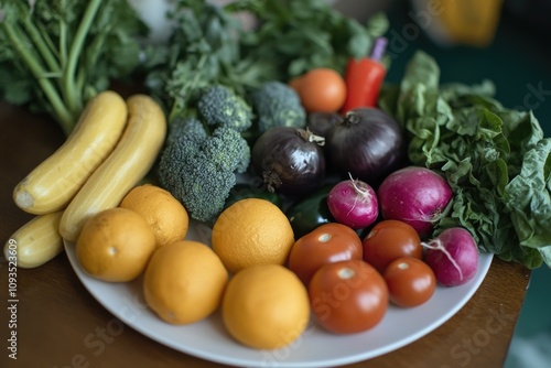 A colorful plate of fresh fruits and vegetables arranged on a table