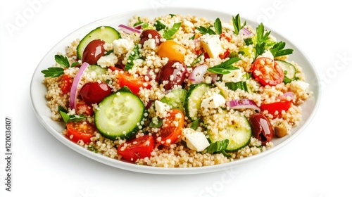 A colorful plate of Mediterranean couscous salad with fluffy couscous, cherry tomatoes, cucumbers