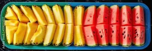 A colorful platter of sliced pineapple and watermelon arranged neatly for serving.