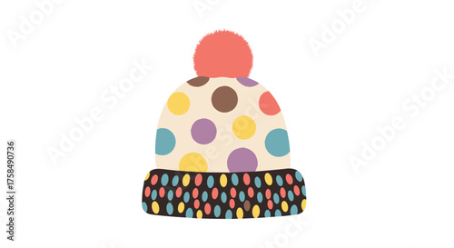A colorful polka dot beanie with a pom-pom on top.