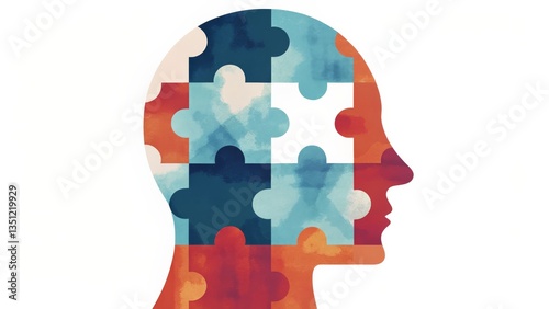 A colorful puzzle piece illustration forming a human head silhouette, symbolizing mental processes, complexity, and integration of thoughts.