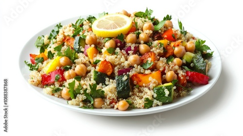 A colorful quinoa salad with tri-color quinoa, roasted vegetables, chickpeas