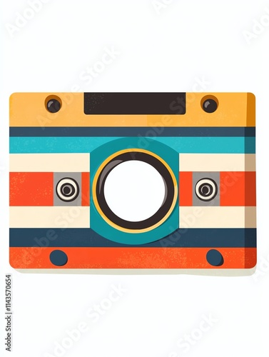 A colorful, retro-style camera illustration featuring bold stripes and a circular lens.
