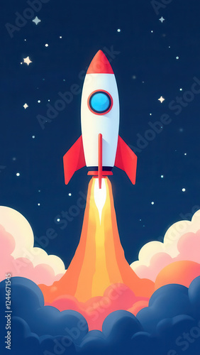A colorful rocket ascends through the night sky, surrounded by vibrant clouds and twinkling stars. The flames from its engines illuminate the dark sky, showcasing the excitement of space travel.